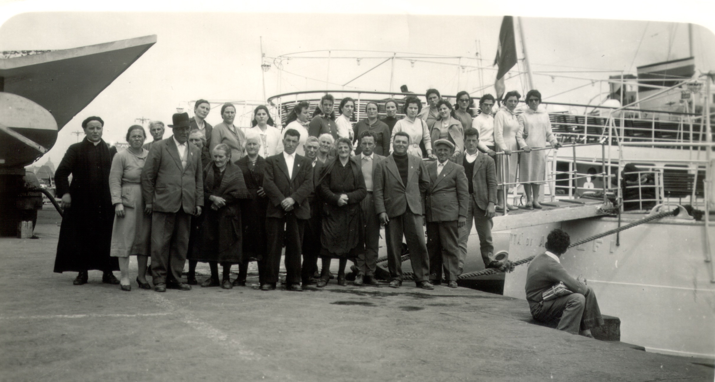 Simbolica foto della metà degli anni ’60 che mi ha colpito molto, perché presenta una scena a dir poco surreale, quasi onirica: montanari (corcumellani in gita) a ridosso di un’imbarcazione ormeggiata nel golfo di Napoli. E pensare che anche tra quei partecipanti, a quell’epoca, ci poteva essere chi non aveva ancora mai visto il mare… Fino alla metà degli anni ’50 per i corcumellani il mare evocava senza dubbio una dimensione aliena, un contesto geografico estraneo oltre che remoto. Per un villaggio a vocazione agricolo-armentizia, abituato a vedersi circondato da montagne, abitato da una popolazione per lo più stanziale con un’economia e una mobilità assai ridotte, dai ritmi di vita lenti e faticosi, il mare era una extrema Thule, un luogo che in sostanza poteva essere solo vagamente immaginato. Fino ad allora infatti il corcumellano aveva vissuto quale diretto discendente di una cultura medievale, che affondava le sue radici in una sorta di autarchia di stampo curtense (in alcune sue forme addirittura debitrice di un sistema sociale ed economico diffusosi con l’impero romano); e per una vita trascorsa in un’area geografica isolata e piuttosto impervia, come quella dell’Abruzzo Ulteriore appenninico, le possibilità di vedere il mare erano veramente scarse: certo, poteva capitare che già nel 1950 qualcuno avesse avuto l’opportunità di vederlo perché – di fatto – durante il servizio militare e le due guerre mondiali era stato costretto a uscire dal paese; oppure perché, ancora prima, qualcun altro era dovuto emigrare in America. Ma ciò costituiva un’eccezione: gran parte della popolazione non l’aveva ancora mai visto. La situazione cambiava bruscamente e assai rapidamente – come del resto in tutta Italia tra gli anni ’50 e gli anni ’60 – quando diversi giovani, ritornando di tanto in tanto da quelle città in cui si erano stabiliti per trovare (e cambiare) lavoro, raccontavano ai corcumellani residenti che cosa fosse veramente il mare.